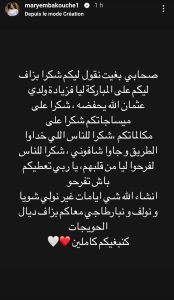 ومن خلال حسابها الرسمي على موقع تبادل الصور والفيدوهات أنستغرام، دونت باكوش رسالتها موظفة تقنية الأنستا سطوري وقالت: “صحابي بغيت نقوليكم شكرا بزاف ليكم على المباركة ليا فازدياد ولدي عثمان الله يحفظه شكرا على ميساجاتكم شكرا على مكالماتكم..شكرا للناس لي خداو الطريق وجاو شافوني، شكرا للناس لي فرحوا ليا من قلبهم، ياربي تعطيكم باش تفرحوا وإن شاء الله غير نولي مزيان ونولف نبارطاحي معاكم بزاف ديال لحويجات”.