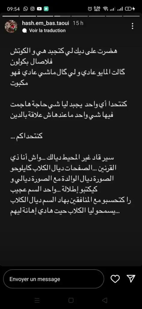 وكتب هاشم البسطاوي في تدوينته التي شاركها عبر خاصية القصص القصيرة قائلا:”الأم ديالي إنسانة مسلمة مغربية عاصية كباقي الأمهات وتعلم أنها كذلك، واش عمرني تكلمت على فضيلة بن موسى بسوء، عمرني جبدت أمل التمار، واش عمرني هاجمت شي ممثلة غي حيت ممثلة “.