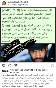 وفي هذا الصدد عبر رشيد الوالي بدوره عن شكره وسعادته برسالة طاليس التي شاركها مع متابعيها وأرفقها بتدوينة قال من خلالها:”كنفرح ملي واحد من الفنانين كياخد من وقتو ويمشي للسينما يشوف عمل فنان آخر، وهذا قليل في الوسط ديالنا مع الأسف، وكأن نجاحك يزعجهم”.