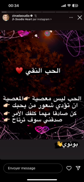 ونشرت زينة الداودية تدوينة عبر حسابها الرسمي على موقع تبادل الصور والفيديوهات إنستغرام، وبالذات عبر خاصية القصص القصيرة حيث كتبت قائلة:”“الحب النقي.. الحب ليس معصية، المعصية أن تؤذي شعور من يحبك، كن صادقا مهما كلفك الأمر.. صدقني، سوف ترتاح.”