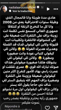 وكتبت نادية العروسي قائلة في تدوينتها:”كل ما كنخرج الزنقة أو كنتلاقا جمهوري الغالي كنسمع نفس الكلمة، أنت زوينة بزاف على التلفزة أنت ضعيفة على اللي كنشوفوك فالتلفزة ولكليبات، أنت قليولة وكاين للي كيقولي قدك قد القملة.”