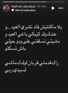 وأضاف هاشم البسطاوي في تدوينته التي نشرها عبر خاصية القصص القصيرة قائلا:”يلا ما كنتيش قادر تشري العيد.. وعندك ولد كيبكي و باغي العيد ومشيتي تسلفتي على ود الحولي باش تسكتو., راك قدمتي قربان لولدك ماشي سيدي ربي.”