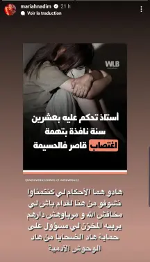 وكتبت ماريا نديم تدوينة عبر حسابها الرسمي على موقع تبادل الصور والفيديوهات إنستغرام، قالت فيها:”ادو هوما الأحكام لي كنتمناو نشوفوا من هنا لقدام باش لي مخافش الله ومرباوهش دارهم يربيه المخزن لي مسؤول على حماية هاد الضحايا من هاد الوحوش الآدمية.”