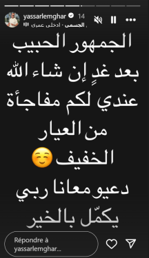 وكتب يسار المغاري في تدوينته التي شاركها مع متابعيه قائلا:” الجمهور الحبيب، بعد غذ إن شاء الله، عندي ليكم مفاجأة من العيار الخفيف، دعيو معانا ربي يكمل بالخير.” دون الكشف عن تفاصيل أخرى تهم المفاجأة التي يحضرها للجمهور.
