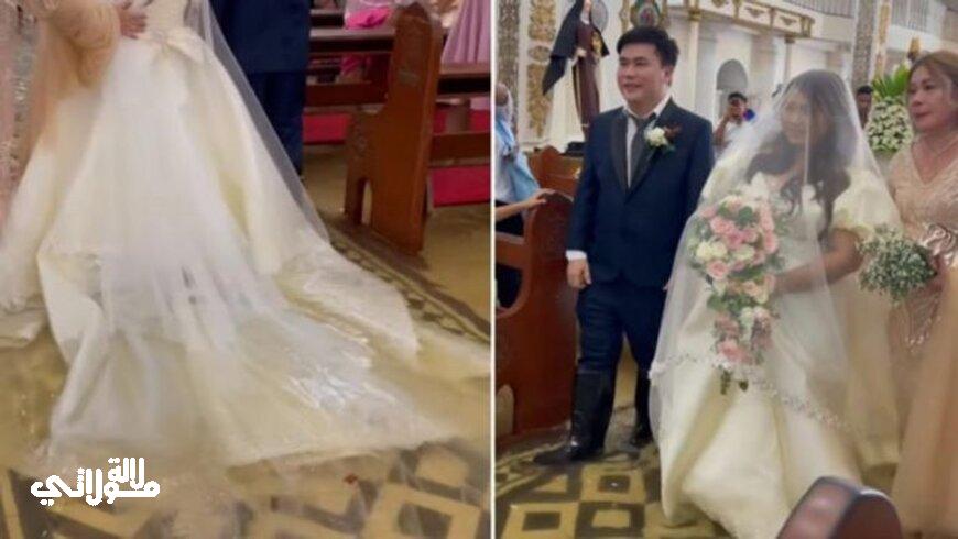 ومشيت العروس ديان إلى المذبح داخل الكنيسة التي غمرت المياه أرضيتها، إذ بدى ذيل فستانها وطرحتها الطويلة وهما يطفوان خلفها في مياه الفيضان بينما ينظر العريس ووالديه.