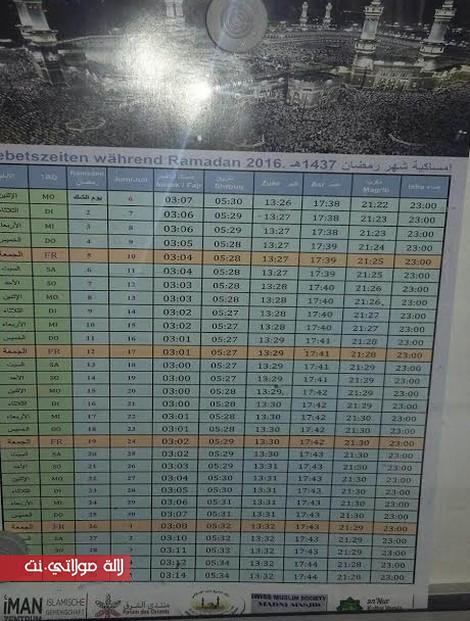 ونشرت هذه الجمعيات في مدينة زيوريخ إمساكية شهر رمضان المبارك التي توضح أن أذان الفجر في اليوم الأول من شهر رمضان سيكون عند الساعة03:07 صباحاً، أما أذان المغرب فيكون عند الساعة21:22 مساء، فيما تم توحيد وقت صلاة العشاء والتراويح طيلة شهر رمضان في تمام الساعة 23:00.