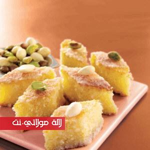 تُمزج الزبدة مع حليب نستله المكثف المحلى والبيكينغ باودر ويُحرّك المزيج جيداً. يُضاف السميد، واللوزا لمطحون والماء وتُحرّك المكوّنات حتى تمتزج جيداً.