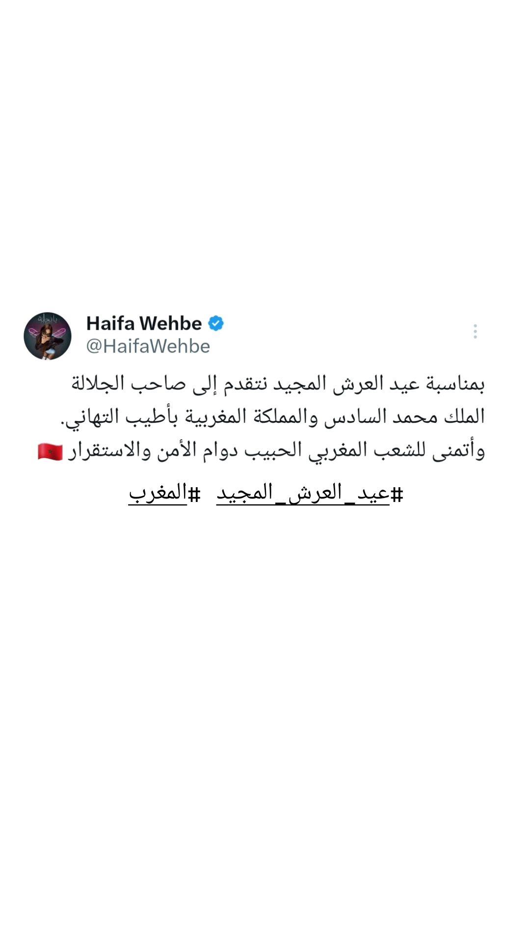 وكتبت هيفاء وهبي في تدوينتها التي نشرتها عبر خاصية القصص القصيرة قائلة:”بمناسبة عيد العرش المجيد نتقدم لصاحب الجلالة الملك محمد السادس والمملكة المغربية بأطيب التهاني وأتمنى للشعب المغربي الحبيب دوام الأمن والاستقرار.”