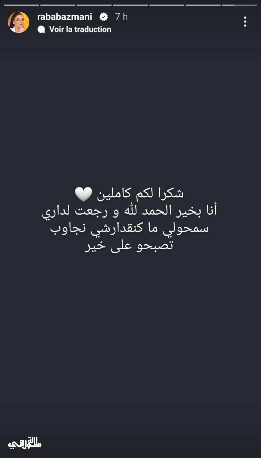 وما هي الا فترة قصيرة حتى طمأنت المؤثرة المغربية رباب أزماني متابعيها عن صحتها من خلال تدوينة شاركتها عبر خاصية القصص القصيرة على صفحتها الرسمية بموقع تبادل الصور والفيديوهات “انستغرام”.