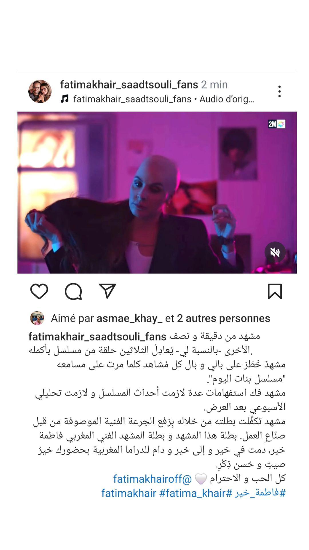 شاركت الفنانة المغربية فاطمة خير عبر حسابها الرسمي على موقع تبادل الصور والفيديوهات إنستغرام، صورا ومقاطع فيديو لها من احد مشاهدها بالمسلسل المغربي “بنات اليوم” الذي تؤدي فيه دورا من ادوار البطولة رفقة نخبة من الفنانات.