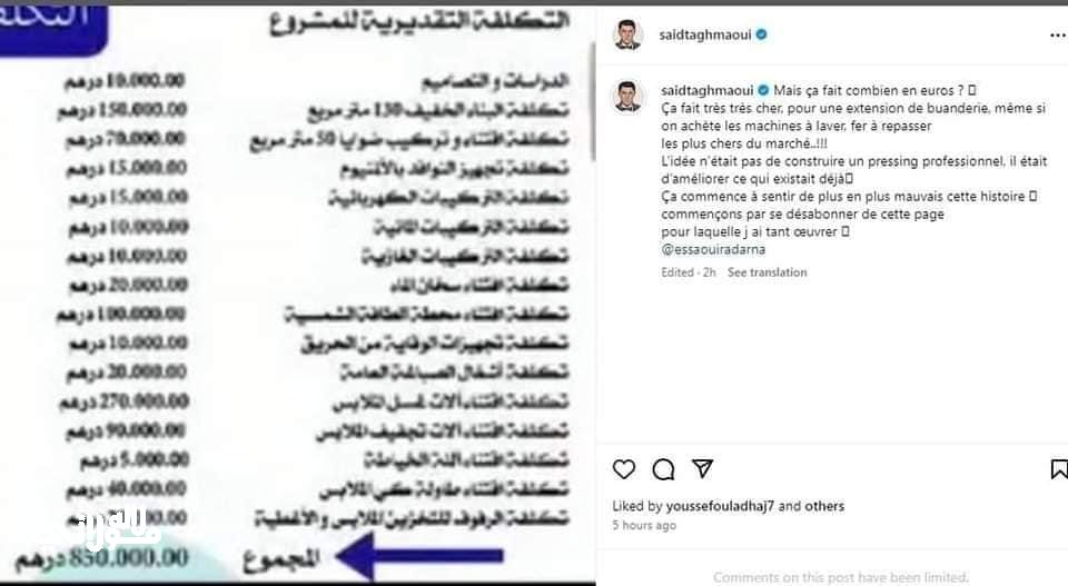 وأوضح سعيد التغماوي في تدوينته أن بعض الفواتير كانت مبالغ فيها بشكل كبير، مشيرا إلى أن صنبور مياه كلف 5000 درهم، فيما خصصت الجمعية 27 مليون سنتيم لشراء آلات الغسيل و9 ملايين سنتيم لآلات تجفيف الملابس.