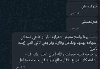 وقال الشاب في رسائله، التي أرسلها عبر “واتس آب”: “ما ترقصيش، ماترقصيش، لبسك يبقى واسع ومفيش شعراية تبان، وتطلعي تستلمي الشهادة بهدوء وبكامل وقارك وترجعي تاني، انتي بنت ناس”.