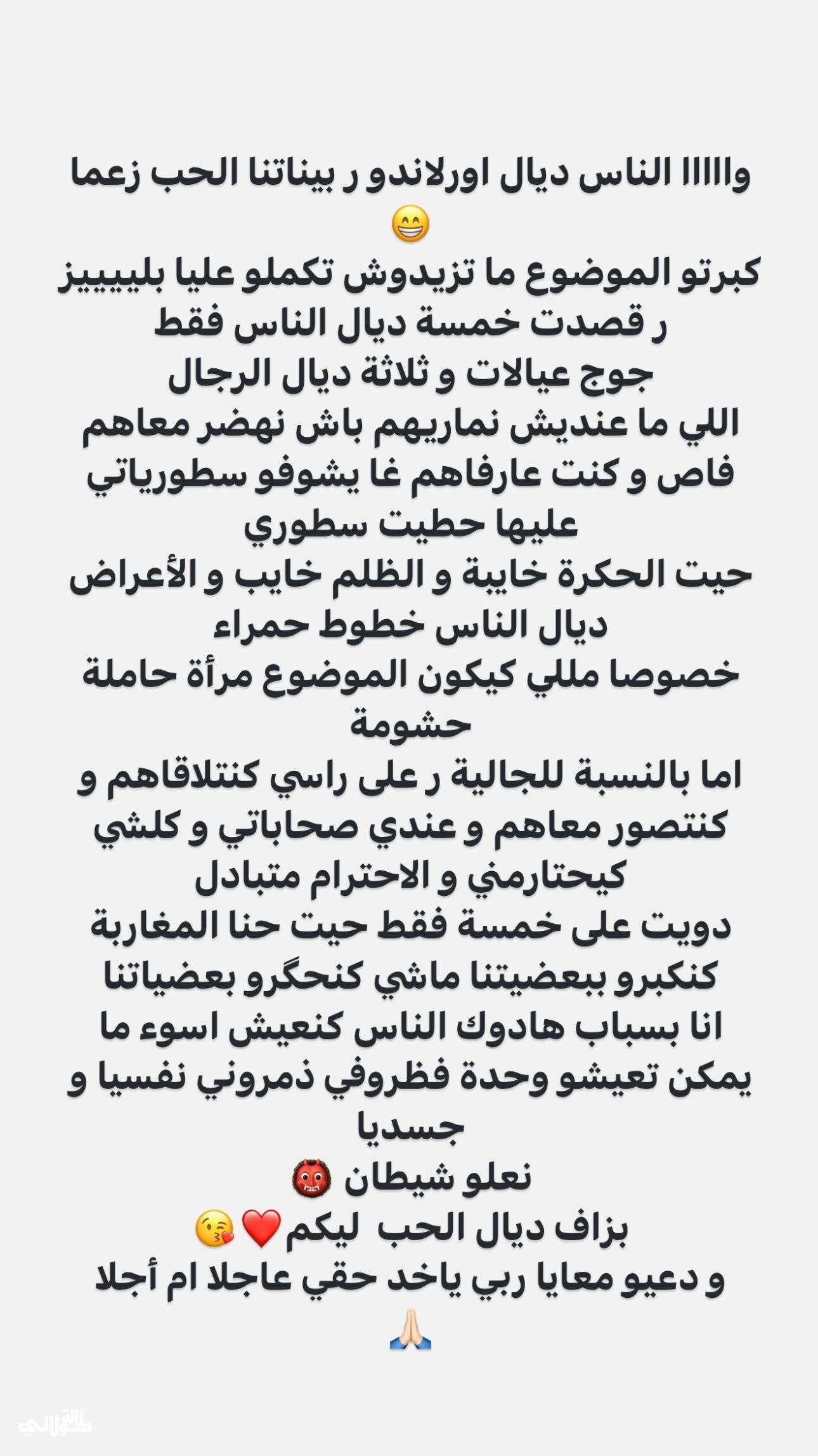 ثم اضافت قائلة:”أما بالنسبة للجالية ر على راسي كنتلاقاهم وکنتصور معاهم وعندي صحاباتي وكلشي كيحتارمني والاحترام متبادل دويت على خمسة فقط حيت حنا المغاربة کنكبرو ببعضيتنا ماشي کنگرو بعضياتنا أنا بسباب هادوك الناس كنعيش أسوء ما يمكن تعيشو وحدة فظروفي ذمروني نفسيا وجسديا نعلو شيطان، بزاف ديال الحب ليكم ودعيو معايا ربي ياخد حقي عاجلا أم أجلا”.