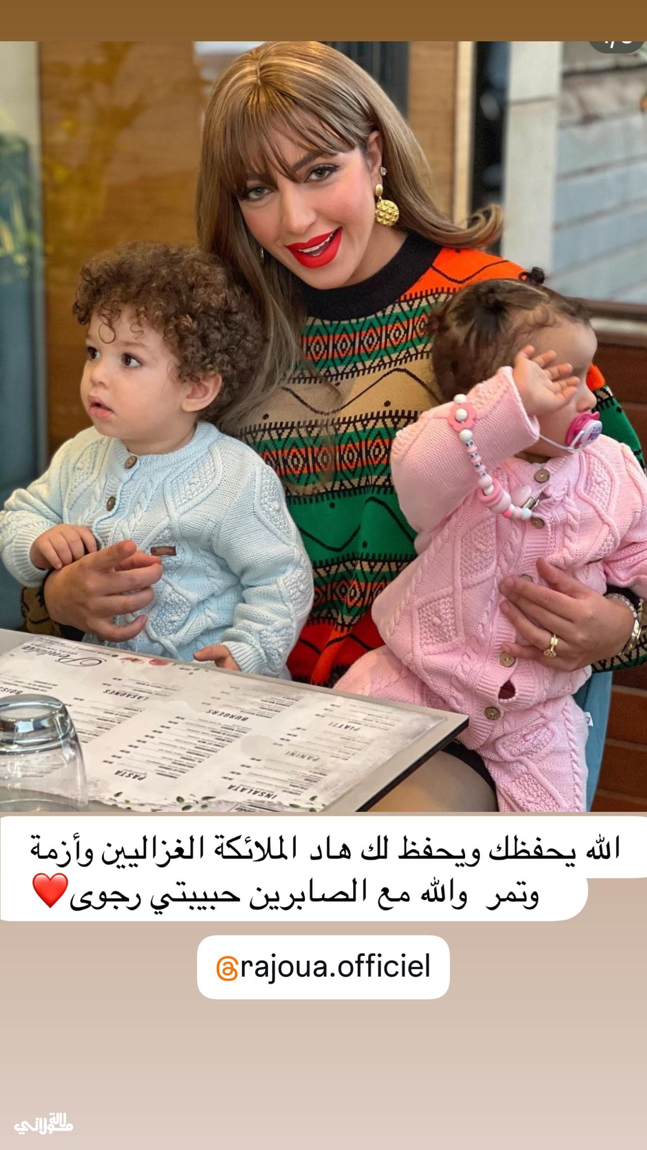 وكتبت لطيفة رأفت في تدوينتها التي أرفقتها بالصورة، عبر خاصية القصص القصيرة قائلة:”الله يحفظك ويحفظ ليك هاد الملائكة الغزالين، وأزمة وتمر والله مع الصابرين حبيبتي رجوى.” حيث عبرت من خلال هذا المنشور على تضامنها الكبير معها في محنتها.