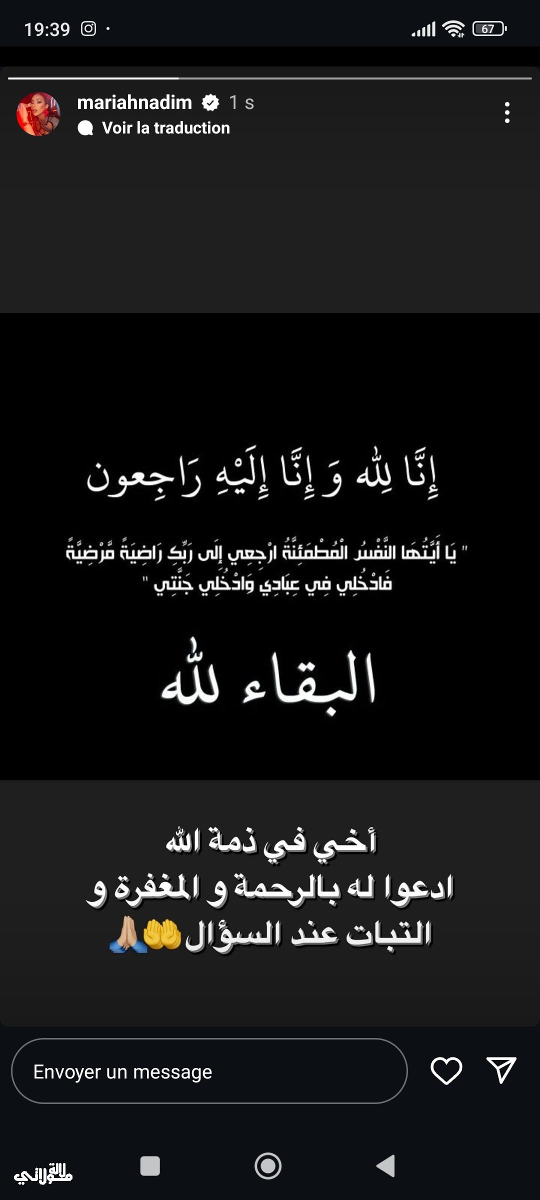 أعلنت الفنانة المغربية ماريا نديم عبر حسابها الرسمي على موقع تبادل الصور والفيديوهات انستغرام، خبر وفاة شقيقها، وهو الخبر الذي فجعت به.