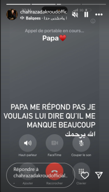 وشاركت شهرزاد عكرود عبر خاصية القصص القصيرة لقطة شاشة الهاتف تظهر من خلالها اتصالها بوالدها الراحل والذي لا زالت تحتفظ على رقم هاتفه حيث عبرت من خلال هذا عن مدى اشتياقها له.