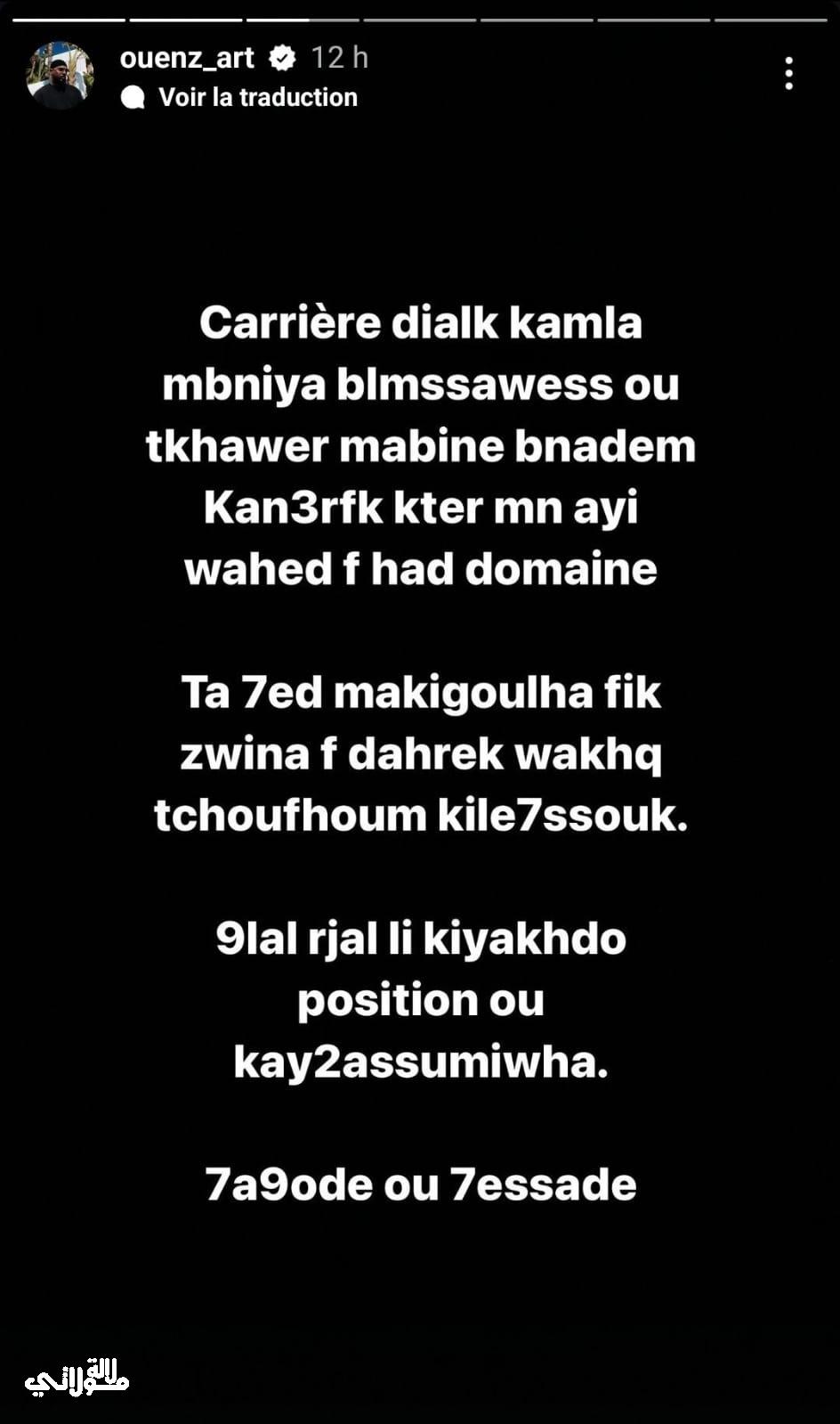 وقال عبد العزيز وينزا في تدوينة شاركها عبر خاصية القصص القصيرة على حسابه الخاص بموقع تبادل الصور والفيديوهات “انستغرام” مايلي: “كاريير ديالك كاملة مبنية بالمساوس”.