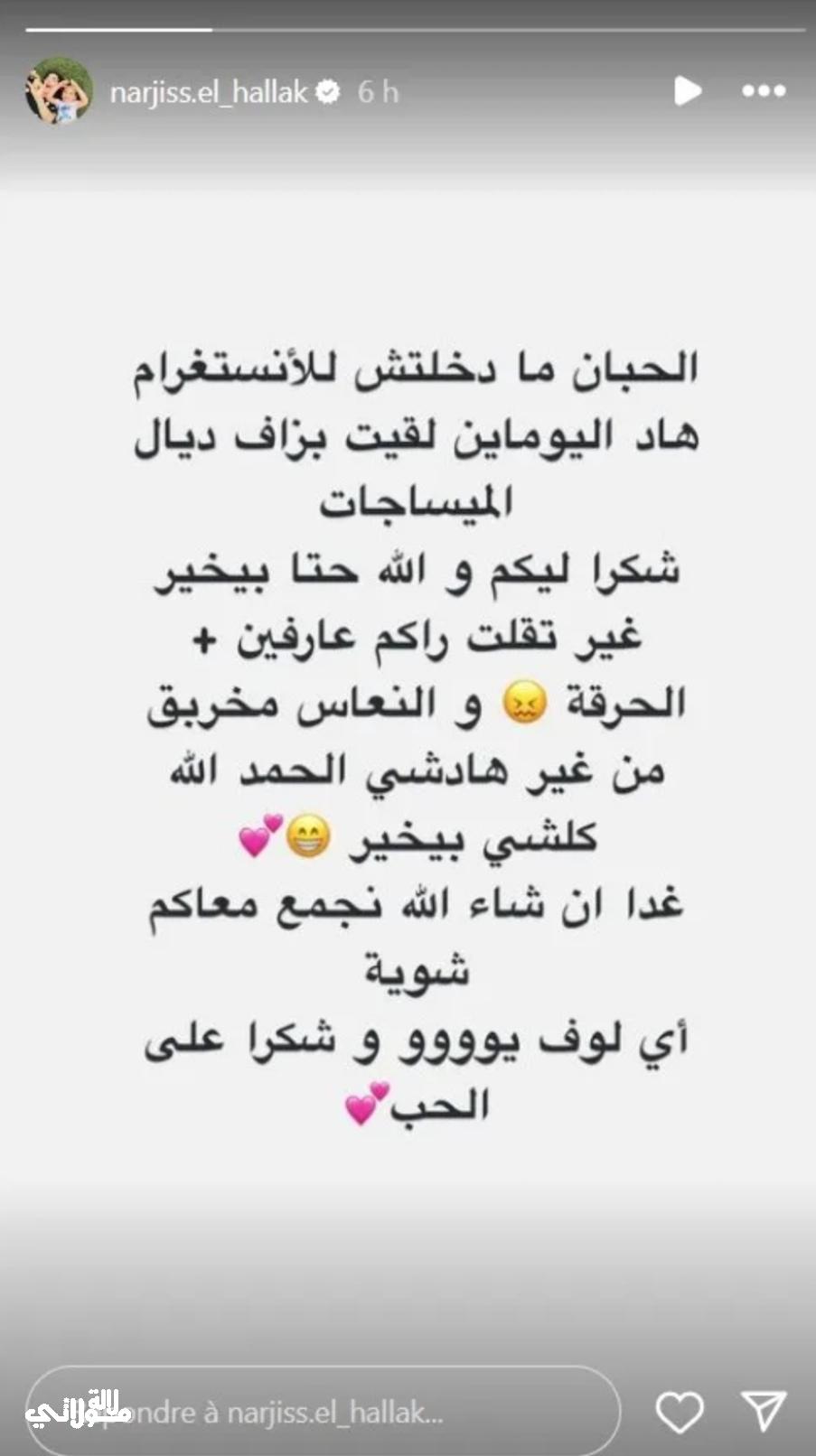وكتبت نرجس الحلاق في تدوينة شاركتها عبر خاصية القصص القصيرة قائلة:”لحبان ما دخلتش للأنستغرام هاد اليوماين لقيت بزاف ديال الميساجات”.