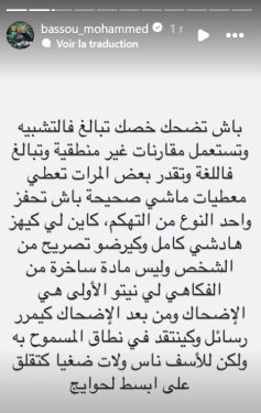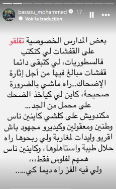 وشارك محمد باسو تدوينة عبر خاصية القصص القصيرة عبر إنستغرام، والتي وضح فيها موقفه وشرح الفرق بين الكوميدية والواقع والطريقة التي يستخدم فيها الكوميدي المعلومات من أجل إضحاك الناس حيث قال:”بعض المدارس الخصوصية تقلقو على القفشات اللي كنكتب فالسطوريات، لي كتبقى دائما قفشات مبالغ فيها من أجل إثارة الإضحاك، راه ماشي بالضرورة صحيحة”.
