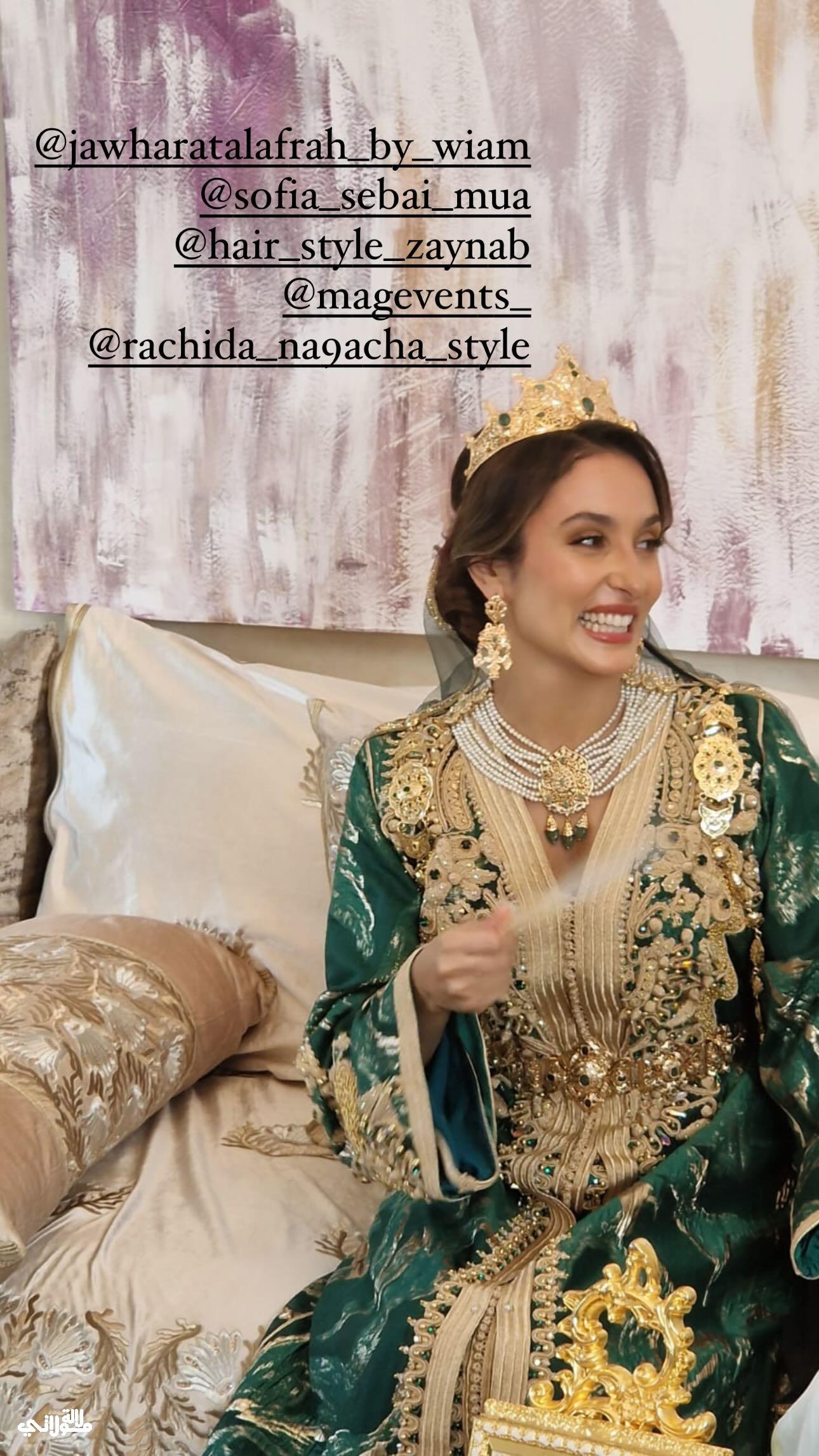 لفتت سارة بيرليس الأنظار بإطلالتها المميزة في ليلة الحناء، حيث ارتدت “تكشيطة” مغربية خضراء اللون مزينة بتطريزات ذهبية، مما أبرز جمالها وتألقها. لم تقتصر اللمسات المغربية على الملابس فقط، بل اعتمدت أيضا تسريحة شعر أنيقة مزجت فيها بين البساطة والرقي، واختارت إكسسوارات ذهبية مغربية أصيلة لتعزز من جمال إطلالتها. كما تزينت سارة بحناء العروس التقليدية، والتي تعتبر جزءا أساسيا من طقوس الأعراس المغربية.