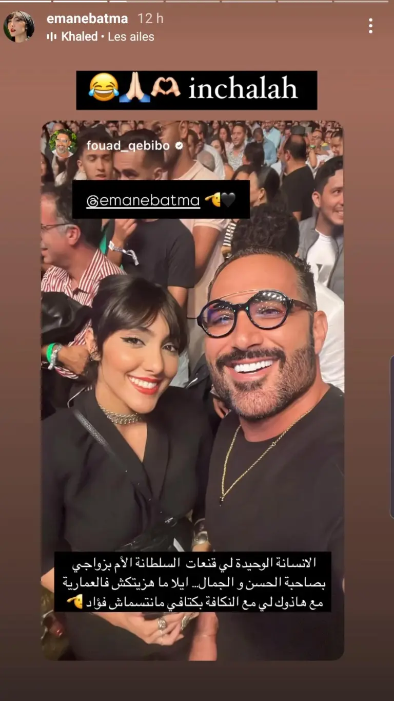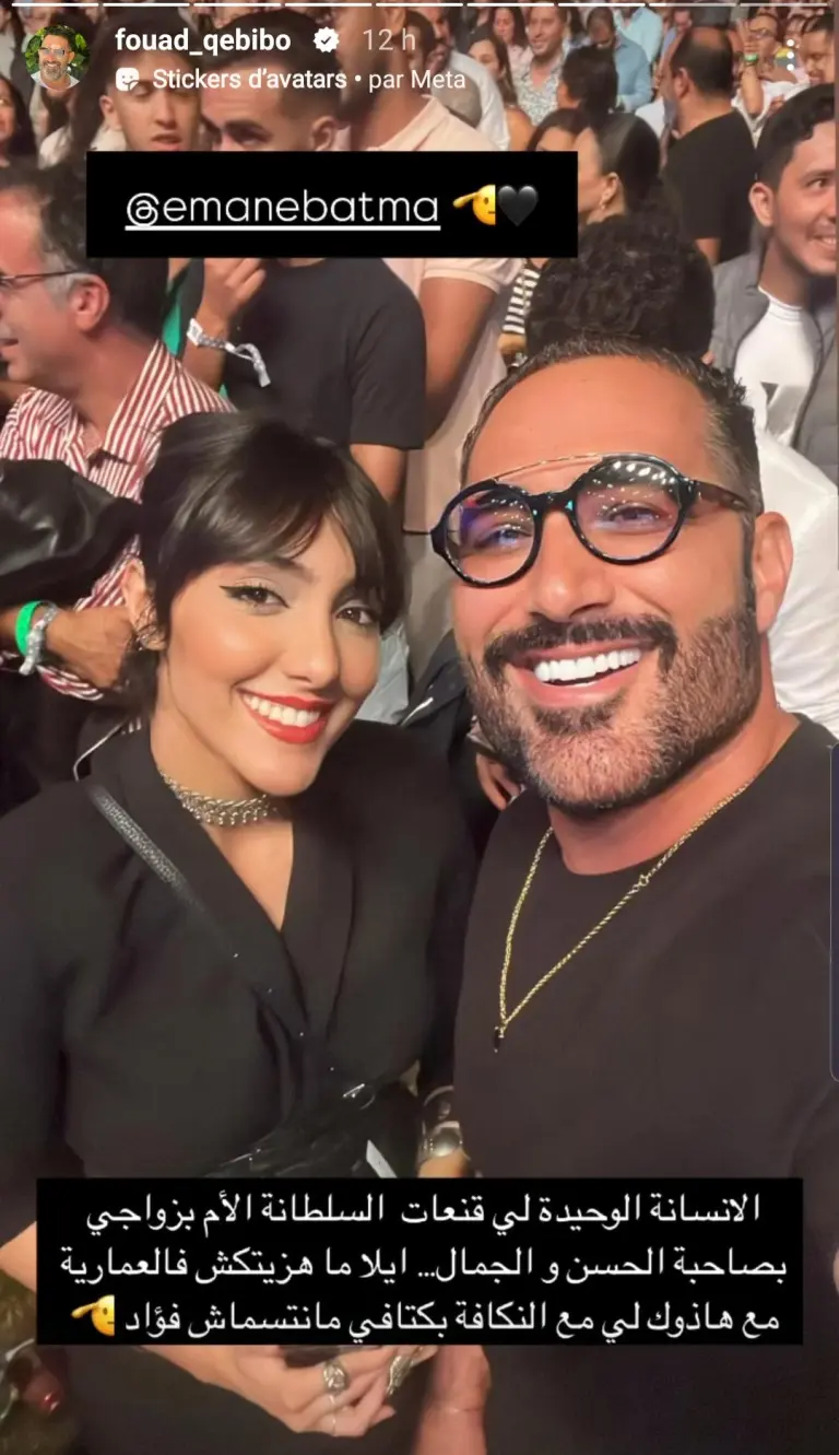 في منشور على حسابه الرسمي على تطبيق “إنستغرام”، شارك قبيبو صورة له برفقة إيمان بطمة، وكتب تعليقا يعبر عن الامتنان لها قائلا: “الإنسانة الوحيدة لي قنعات السلطانة الأم بزواجي بصاحبة الحسن والجمال، إيلا ما هزيتكش فالعمارية مع هاذوك لي مع النكافة بكتافي ما نتسماش فؤاد”. وبهذا، أبدى قبيبو امتنانا كبيرا لإيمان التي ساندته في أهم مراحل حياته الشخصية، معبرا عن ذلك بأسلوب طريف يتناسب مع طبيعة المناسبة.