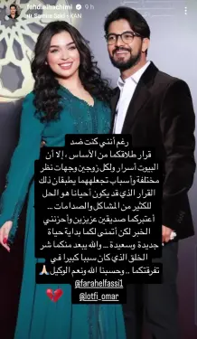 تعبيرا عن حزنه العميق لهذا الخبر، كتب الهاشمي قائلا: “أعتبركما صديقين عزيزين وأحزنني الخبر”، في إشارة إلى علاقته القوية بهما. كما أضاف تمنياته بأن يحظيا ببداية جديدة وسعيدة، مع دعاء بأن يبعد عنهما “شر الخلق” الذي كان أحد الأسباب الرئيسية في تفرقهما، وفقا لتعليقه المؤثر. كلمات الهاشمي هذه حملت في طياتها شعورا بالتعاطف والتضامن مع لطفي والفاسي، ودعاءه كان بمثابة تعبير عن أمله في أن يتجاوزا هذه المرحلة الصعبة.