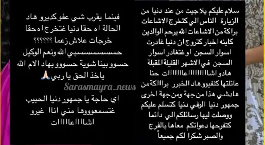 وفي تعليق لها على حسابها في إنستغرام، أعطت ابتسام بطمة توضيحا مباشرا بخصوص ما يتم تداوله حول شقيقتها. وأكدت أن كل ما يقال حول خروج دنيا من السجن لا يمت للحقيقة بصلة. وأضافت أنها للتو عادت من زيارتها لدنيا، مشيرة إلى أن شقيقتها لا تزال داخل أسوار السجن، مما ينفي صحة ما تم نشره. جاء تعليقها مصحوبا بتعبير عن استيائها من ترويج مثل هذه الأخبار، مطالبة الناس بمزيد من الوعي والمسؤولية.