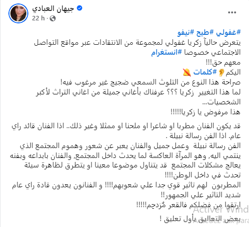 نشرت العبادي عبر صفحتها الشخصية على موقع “فيسبوك” تدوينة صريحة تعكس استياءها من الطابع الشعبي الذي غلب على آخر إصدارات الغافولي، معتبرة أن هذا التحول الفني لا يليق بمسيرته التي عرفت سابقا بتقديمه لأغان مستوحاة من التراث المغربي ومن شخصيات فنية مرموقة. كلماتها كانت واضحة وحادة حيث وصفت هذه الأعمال بأنها ضجيج غير مرغوب فيه وأبعد ما تكون عن الفن الراقي.