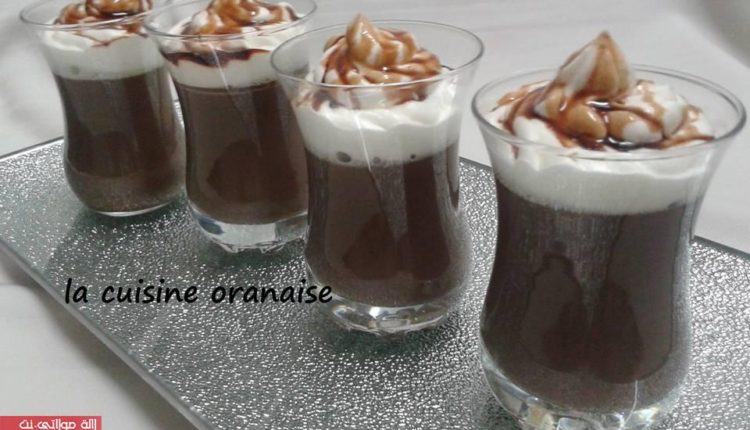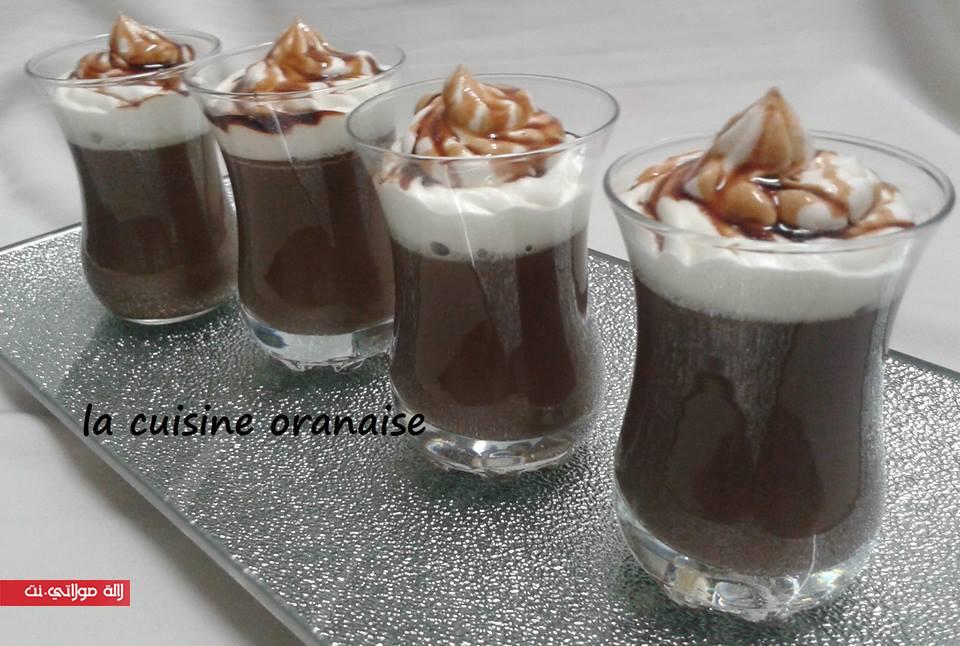 نخلط جيدًا الحليب،سكر،كاكاو، نشاء،بيض ثم نضعهم فوق نار متوسطة مع التحريك المستمرحتى يتكثف الخليط ثم نصبه في كُؤوس التقديم نغطيه ونتركه يبرد،عند وقت التقديم نزينه بالشانتيي و الكراميل.