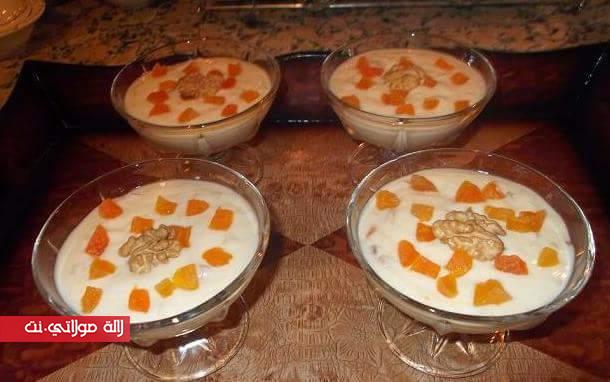 نخلط الكل و نخوي الخليط فكؤوس التقديم و نزينهم بأنصاف الكركاع و طريفات المشماش ونقدموهم بالصحة والراحة