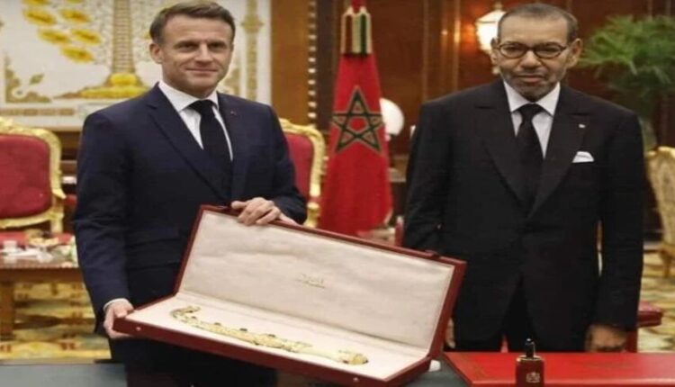 جلالة الملك يقدم خنجرا مغربية مطلية بالذهب ومرصع بالأحجار الكريمة للرئيس ماكرون