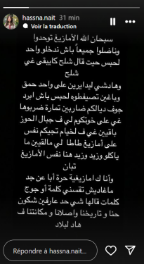 وعلقت حسناء نايت قائلة: “أنا كأمازيغية حرة أبا عن جد، ماغاديش تقيسني كلمة أو جوج كلمات قالها شي حد”، مشددة على أن الأمازيغ الأصيلين يعرفون قيمتهم الحقيقية في المجتمع المغربي. فأصلهم وتاريخهم الغني هو ما يشكل هويتهم، وليس آراء عابرة قد تثير جدلا غير مجد. فهي تدعو إلى الاعتزاز بالهوية الأمازيغية وتعزيز القيم الثقافية، بينما تعمل على مواجهة التحديات الحياتية التي تواجه مجتمعها.
