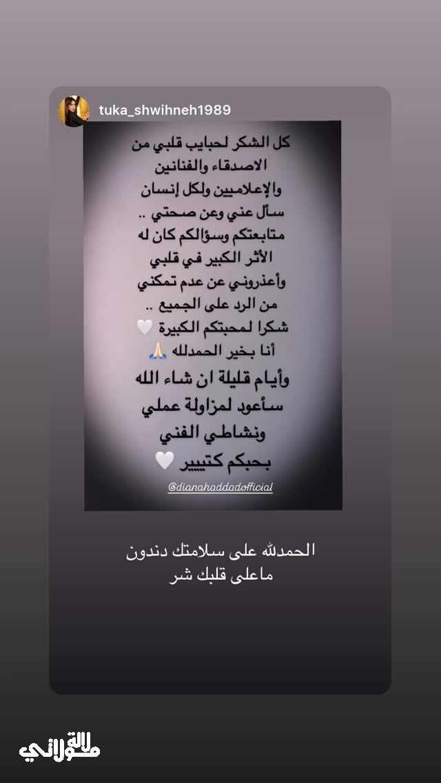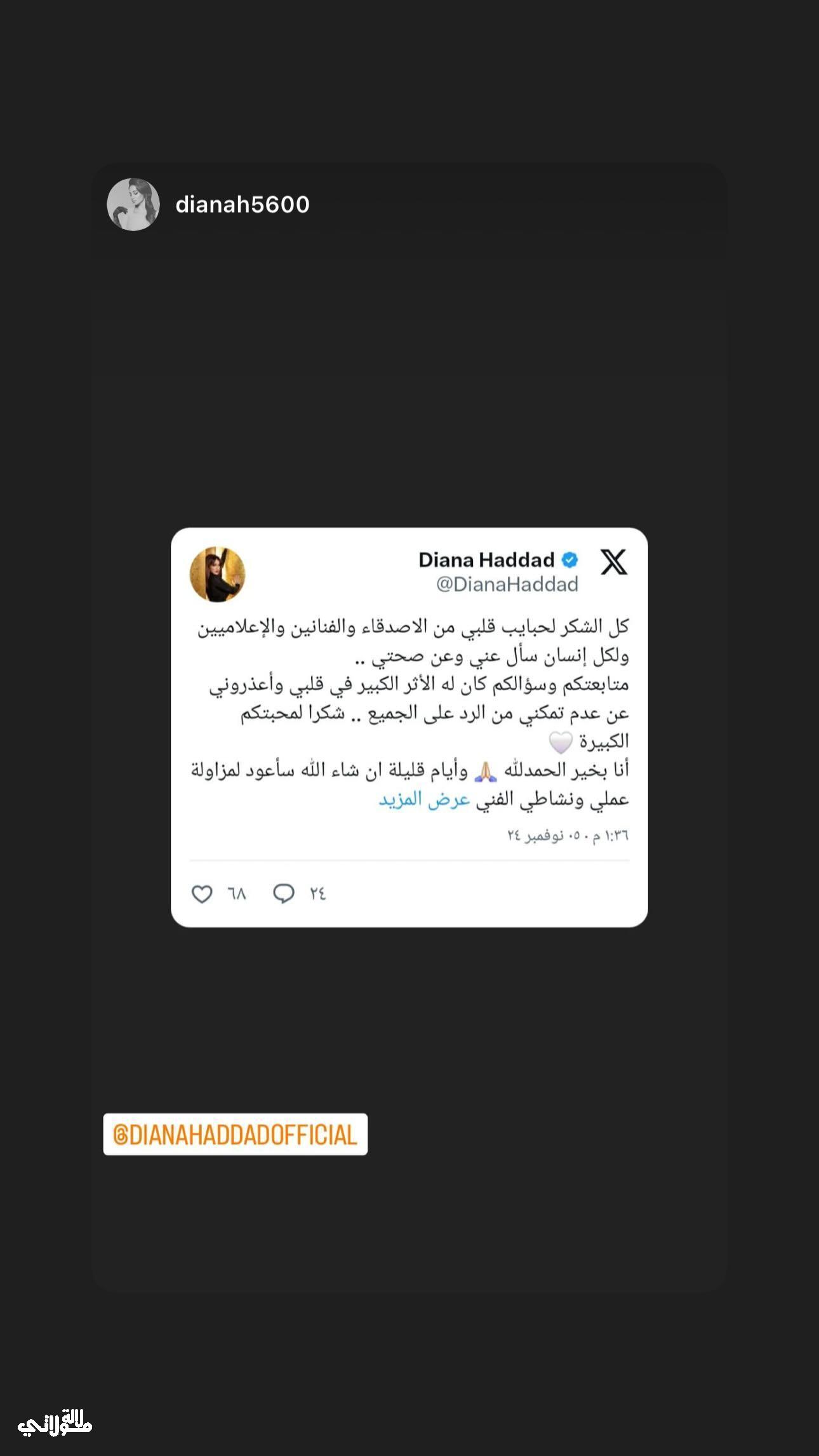 وتوجهت ديانا بالشكر الكبير إلى كل من عبر عن دعمه ووقف إلى جانبها في هذه الفترة، ورغم رغبتها العميقة في الرد على كل رسالة بعثت إليها، اعتذرت عن عدم قدرتها على التواصل مع الجميع، مشيرة إلى أن كثرة الرسائل والمشاعر الدافئة التي وصلت إليها جعلتها ممتنة وسعيدة، لكنها لم تتمكن من الرد عليها كلها، وهو ما عبرت عنه بقولها: “كل الشكر لحبايب قلبي من الأصدقاء والفنانين والإعلاميين ولكل إنسان سأل عني وعن صحتي، متابعتكم وسؤالكم كان له الأثر الكبير في قلبي، واعذروني عن عدم تمكني من الرد على الجميع، شكرا لمحبتكم الكبيرة”.
