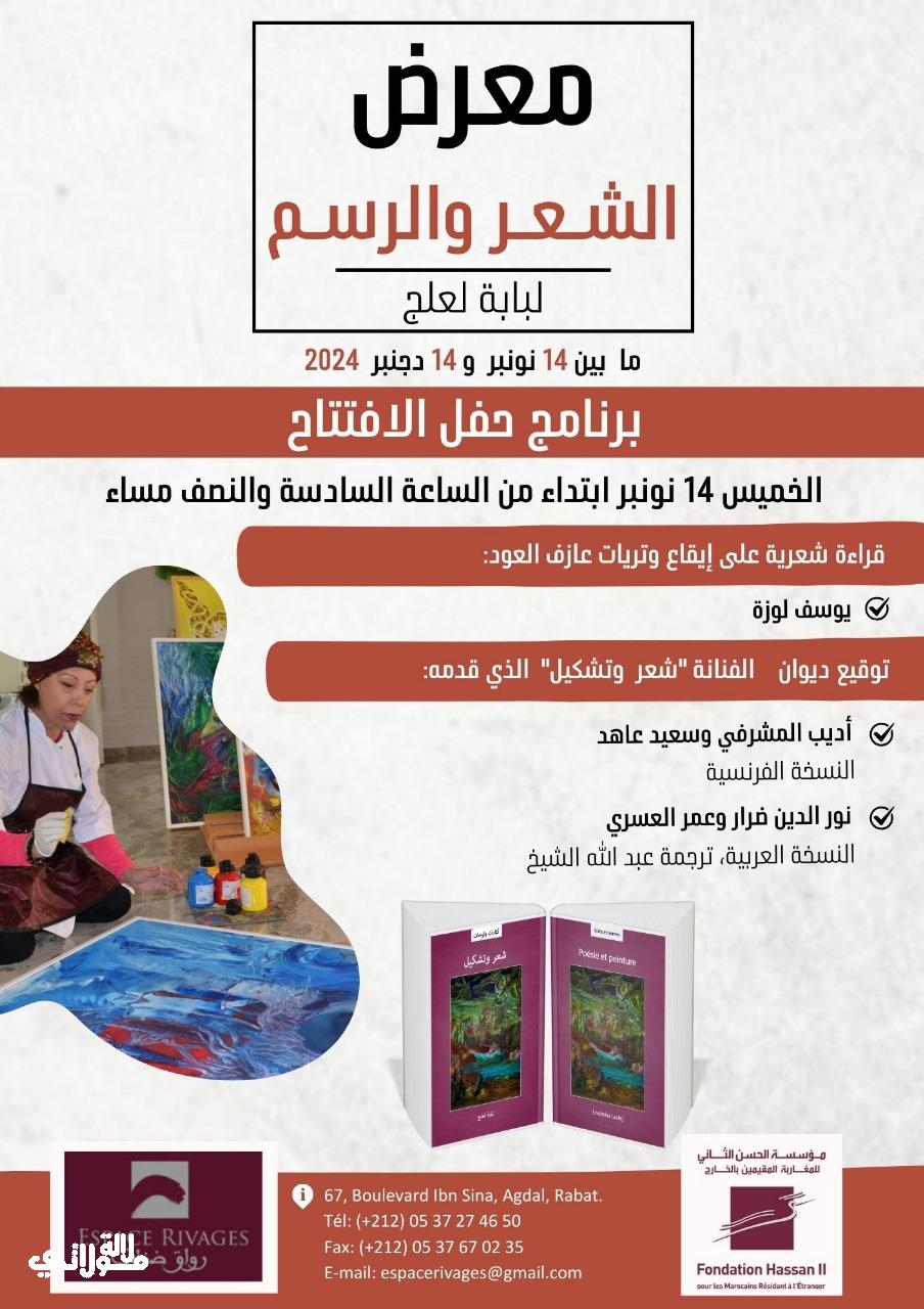 تنظم مؤسسة الحسن الثاني للمغاربة المقيمين بالخارج معرضاً للفنانة المغربية الفرنسية لبابة لعلج، التي تميزت بتجربة فريدة تمزج بين الشعر والرسم. يأتي المعرض بعنوان “الشعر والرسم” ويستمر من 14 نوفمبر إلى 14 ديسمبر 2024، في فضاء ضفاف، ويُفتتح المعرض في 14 نوفمبر بحفل يضم قراءات شعرية ترافقها أنغام العود من عزف يوسف لوزة.