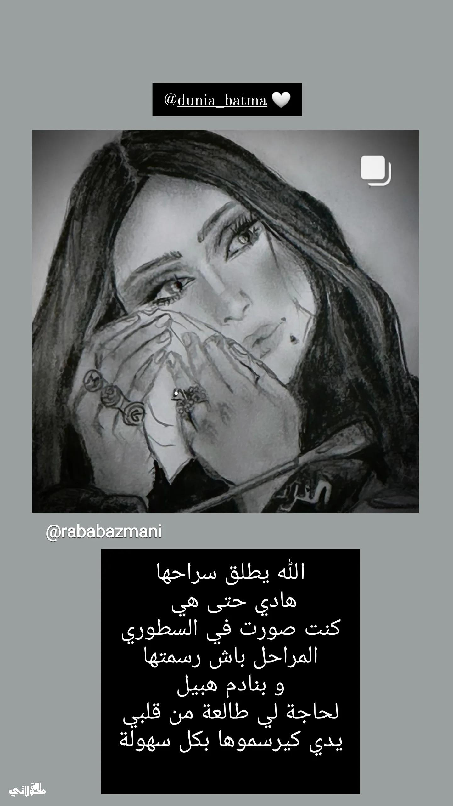 ومن خلال حسابها على إنستغرام، شاركت رباب رسمتها الخاصة بدنيا بطمة التي أظهرتها بألوان تعكس مشاعرها. استخدمت رباب ميزة “الآنستا سطوري” لمشاركة هذه الرسمة مع متابعيها، وأرفقتها بتعليق يحمل معاني التضامن والدعاء. وجاء في تعليقها: “الله يطلق سراحها هادي حتى هي كنت صورت في سطوري المراحل باش رسمتها وبنادم هبيل الحاجة لي طالعة من قلبي يدي كيرسموها بكل سهولة.” بهذه الكلمات، أظهرت رباب تأثرها وتمنياتها بالخير لبطمة في محنتها، مشيرة إلى أن الرسم كان تعبيراً صادقاً عن مشاعرها التي تنبع من القلب.