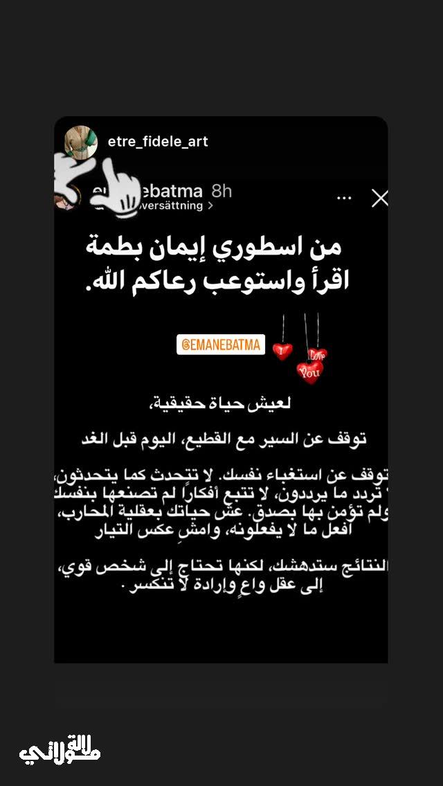 شاركت الفنانة المغربية إيمان بطمة متابعيها رسالة ملهمة عبر حسابها الرسمي على منصة “إنستغرام”. تضمنت هذه الرسالة نصيحة مباشرة تدعو فيها جمهورها للتوقف عن اتباع الآخرين بشكل أعمى، والتركيز على بناء شخصية مستقلة تسعى لتحقيق حياة حقيقية قائمة على القناعات الذاتية. جاءت كلماتها بمثابة تحفيز للتفكير بعمق والابتعاد عن تقليد الآخرين دون تفكير.