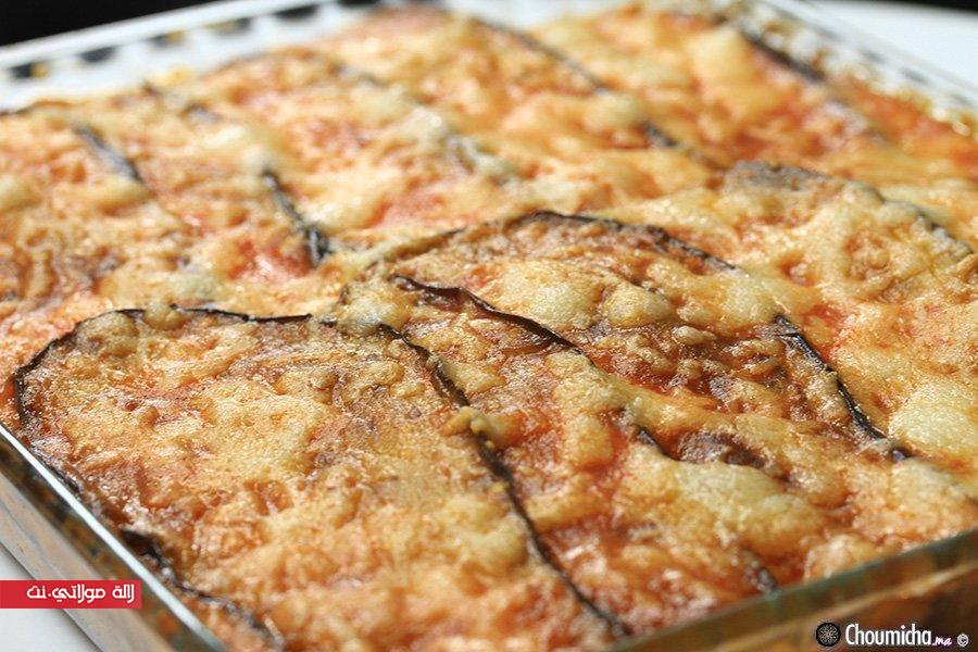 في صحن الفرن، تصفف شرائح البادنجان، تسقى بالصلصة ثم تزين باللحم المفروم والجبن المبشور. تعاد نفس العملية ثم تضاف طبقة من شرائح البادنجان. تسقى شرائح البادنجان بالصلصة وينثر فوقها الجبن المبشور.تطهى لازانيا البادنجان في الفرن المسخن على درجة الحرارة 180 لمدة 30 دقيقة. يقدم الطبق ساخنا.
