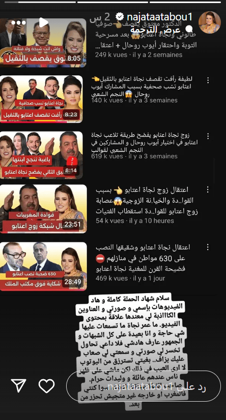 وجهت نجاة اعتابو رسالة مباشرة لجمهورها عبر خاصية “الستوري” على حسابها في “إنستغرام”، أكدت من خلالها أن الفيديوهات المتداولة عن حياتها تحتوي على أكاذيب وتلفيقات تهدف إلى تدمير صورتها. وأوضحت أنها لم تكن يومًا محط أي اتهامات أو انتقادات تمس مصداقيتها، وأنها ترفض أي محاولة للنيل من سمعتها التي عملت على الحفاظ عليها طوال مسيرتها الفنية