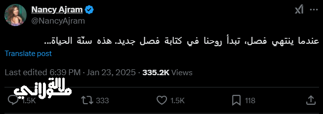 أثارت الفنانة اللبنانية نانسي عجرم حالة من الجدل الكبير على مواقع التواصل الاجتماعي بعد نشرها لتدوينة غامضة عبر حسابها على منصة “إكس”. حيث كتبت: “عندما ينتهي فصل، تبدأ روحنا في كتابة فصل جديد. هذه سنة الحياة”، وهو ما جعل الكثير من المتابعين يتساءلون عن مغزى كلماتها. فقد اعتبر البعض أن هذه العبارة قد تكون إشارة إلى نهاية علاقتها بزوجها، طبيب الأسنان فادي الهاشم، وبالتالي تداولوا فكرة حدوث انفصال بينهما.