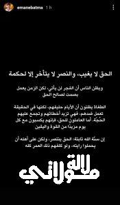 كما لم تقتصر إيمان على هذه التدوينة فقط، بل شاركت أيضًا عبر خاصية “الستوري” على انستغرام، وكتبت: “الحق لا يغيب والنصر لا يتأخر إلا لحكمة، ويظن الناس أن الفجر لن يأتي لكن الزمن يعمل بصمت لصالح الحق”. وكأنها تؤكد على أن الحق سوف يظهر في الوقت المناسب، مهما طال انتظاره.