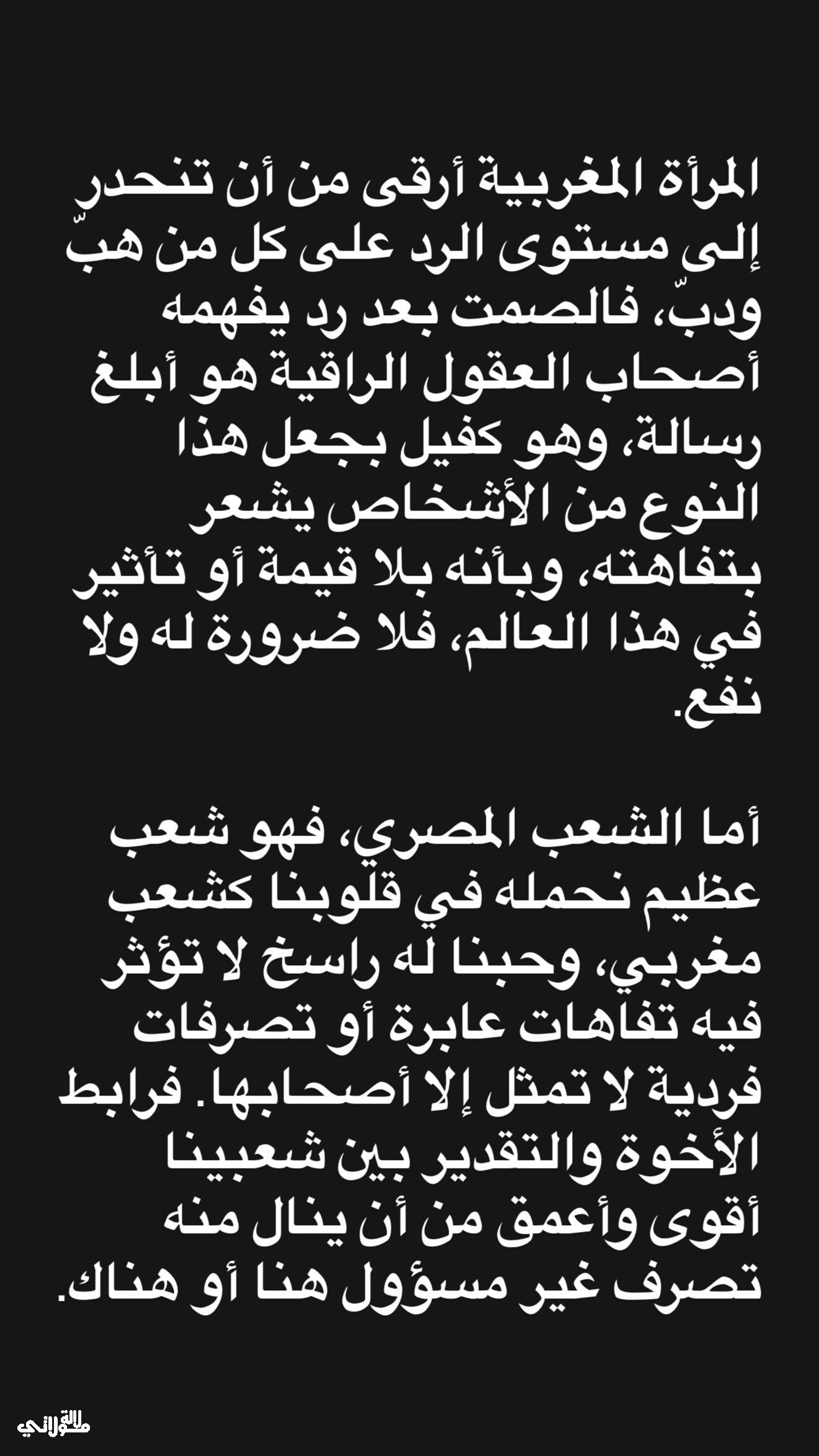 وأكد سعد لمجرد في تدوينته أن الشعب المغربي يكن للشعب المصري كل التقدير والاحترام، قائلاً: “الشعب المصري شعب عظيم ونحن نحملهم في قلوبنا.” وتابع أن الرابط الأخوي بين الشعبين أقوى من أن تهزه التصرفات غير المسؤولة. من خلال هذا التصريح، أظهر سعد لمجرد موقفه الثابت تجاه الوحدة بين الشعبين المغربي والمصري، رغم المحاولات لتشويه الصورة عبر تصرفات فردية.