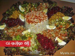 كنصلقو الباربا ونقطعوها طراف صغار.كنقطعو مطيشة كذلك بعدما قشرناها وزولنالها البذور وكنشلضو معاها بصيلة والخيار مكرد.والذرة راها معلبة.كنعطرو للبطاطا وخيزو جلبانة ذرة لوبيا بقليل من الملح حسب الذوق القليل من الكامون والابزار والقليل من الخل وبودرة الثوم وشوية المعدنوس وزيت اركان يمكن ليكم ديرو اي زيت وكذلك بالنسبة لباقي الخضروالدرة حتى هي نفس العطرية مع اضافة الهريسة كتجي بنينة بالحار والروز نضيفو ليه الطون والدرة وكاشير وفروماج حمر نديرو الروز في الوسط والخضر في الجوانب ونزينو بالبيض مثل ما في الصورة