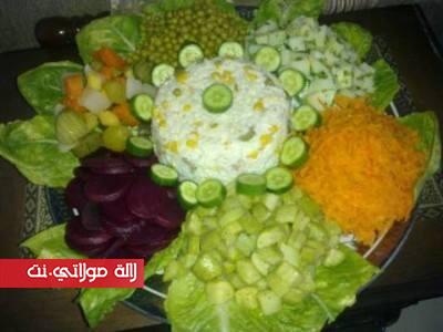 ناخذ صحن دائري ونفرش فيه الخس وناخذ الارز المسلوق نحط عليه 2 ملاعق مايونيز وملعقتين زيت زيتون وذرة وزيتون شرايح ونخلط الكل مع بعض ونملي زبدية دائرية بالارز ونقلبها وسط الصحن بعدين في الجوانب نضع بطاطس متبلة بفلفل اسود وكزبرة وملح وشوية خل وجنبها نضع شمندر مسلوق متبل بزيت زيتون وفلفل اسود وعصير ليمونة وملح ونضع المخلل والجزر المبشور والبازيلاء مسلوقة ومتبلة بفلفل اسود وملح وزيت زيتون ونحاول نرتب الخضار بشكل مرتب وبالعافية