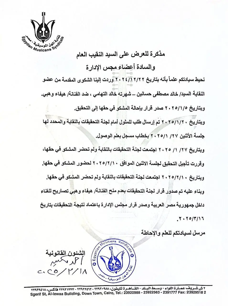 تقدّم عضو النقابة خالد التهامي بشكوى ضد هيفاء وهبي، وهو ما دفع النقابة إلى اتخاذ خطوات قانونية تقضي بحرمانها من الحصول على تصاريح الغناء في مصر. القرار جاء بعد غياب الفنانة عن جلسات التحقيق التي تم تحديدها في بداية عام 2025، والتي كانت تهدف إلى التحقيق في تفاصيل القضية التي كانت قد نشأت بين الطرفين.