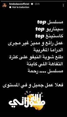 وجاء موقفها هذا ليعزز الانطباع العام الذي تشكل لدى فئات واسعة من الجمهور المغربي، الذين عبّروا بدورهم عن إعجابهم بالمسلسل، سواء من خلال التفاعل على منصات التواصل الاجتماعي أو عبر النقاشات التلفزيونية والنقدية، التي أشادت بمستوى التمثيل وحرفية الإخراج وقوة الحبكة.