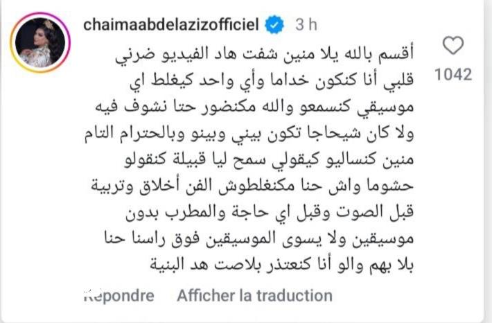في هذا السياق، تدخلت الفنانة شيماء عبد العزيز، زميلة الشنواني في المجال الفني، لتعبر عن استيائها الشديد من التصرف الذي وقع في الحفل. عبر حساباتها على مواقع التواصل الاجتماعي، وجهت رسالة قوية تنتقد ما حدث، مشيرة إلى أن سلوك الشنواني يتناقض مع قيم الاحترام المتبادل بين الفنانين وفرقهم الموسيقية. وقالت: “أقسم بالله بلا منين شفت هاد الفيديو ضرني قلبي”، مؤكدة أن الفنان يجب أن يتعامل باحترام مع الجميع، خاصة مع الموسيقيين الذين يساهمون في إنجاح العرض الفني.