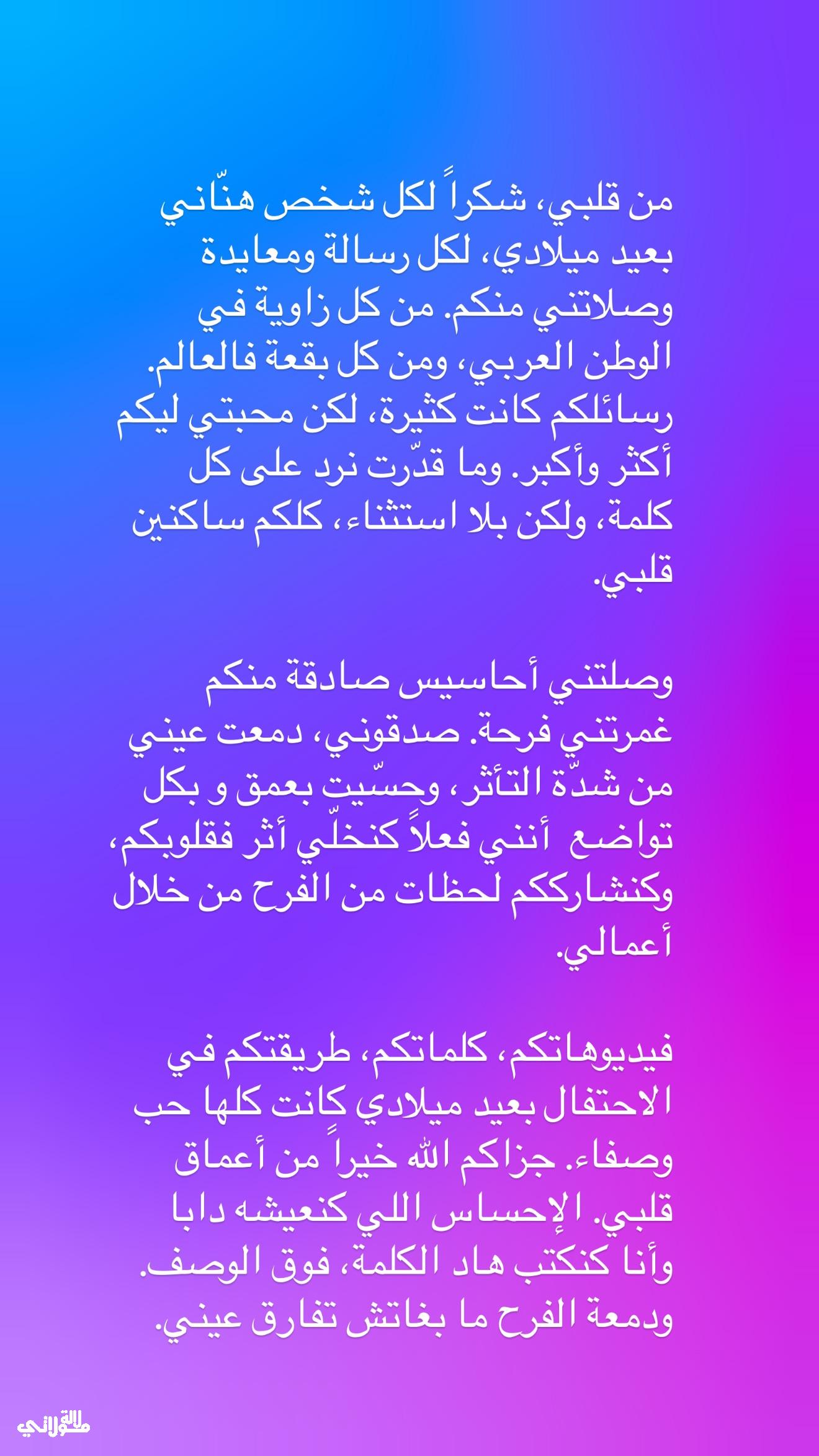 من خلال تقنية “الستوري” عبر منصته، كتب سعد لمجرد: “من قلبي شكراً لكل من هنأني بعيد ميلادي، لكل رسالة أو معايدة وصلاتني منكم.” كانت هذه الكلمات البسيطة مليئة بالصدق والشكر، حيث أظهر الفنان مدى تقديره الكبير لكل فرد من جمهوره الذين تذكروا المناسبة وشاركوه في فرحته.