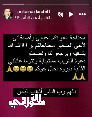 وكشفت سكينة عن موقفها الإنساني الحساس تجاه شقيقها، حيث طلبت من متابعيها أن يظلوا إلى جانبها في هذه اللحظات الصعبة. فقد كتبت في رسالتها المؤثرة: “محتاجة دعواتكم أحبابي وأصدقائي لأخي الصغير، محتاجاكم بزاف الله، يشافيه ويرجعو لنا ولصحتو”، وهي كلمات حملت معها الكثير من الأمل والدعاء بالشفاء العاجل.