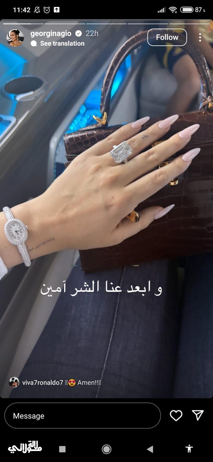 في خطوة لافتة أثارت اهتمام المتابعين، شاركت جورجينا رودريغيز، شريكة النجم البرتغالي كريستيانو رونالدو، متابعيها عبر خاصية الستوري على حسابها الرسمي في إنستغرام، بصورة ليدها وهي ترتدي مجوهرات فاخرة، مرفقة بعبارة مكتوبة باللغة العربية “وابعِد عنا الشر آمين”.