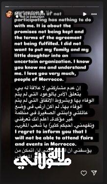 وتوجهت الفنانة في منشوراتها بكلمات صادقة تعكس احترامها وتقديرها الكبيرين للمغاربة، حيث عبرت عن عمق العلاقة التي تربطها بهذا الجمهور الوفي، وأكدت أنها تكن له كل الحب والامتنان. كما شددت على أنها تثق في تفهم المغاربة لموقفها، موجهة إليهم رسالة محبة تضمنت كلمات مؤثرة، حيث قالت: “أعلم أنكم تعرفونني وتفهمونني، أحبكم كثيرا يا شعب المغرب”.